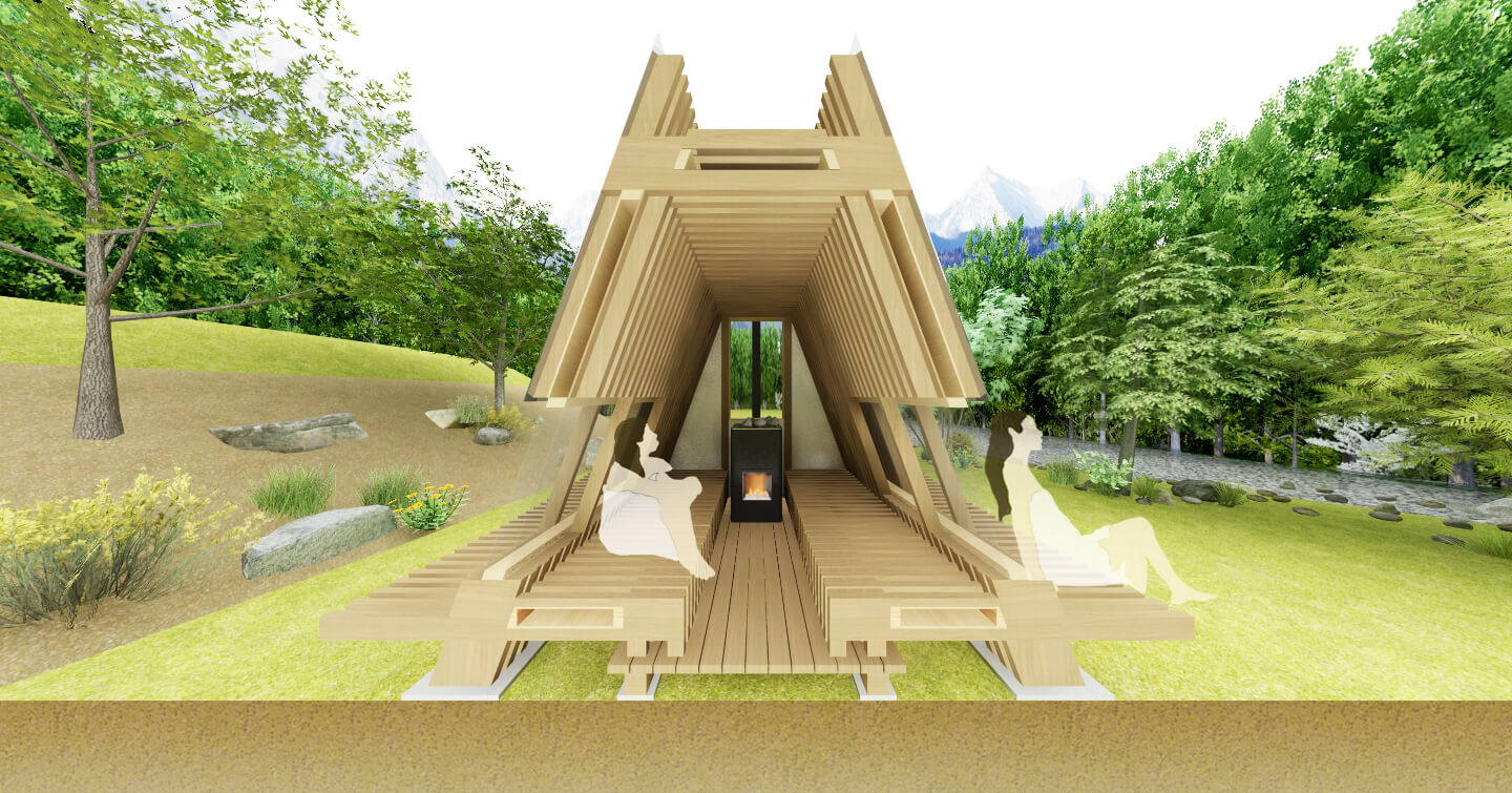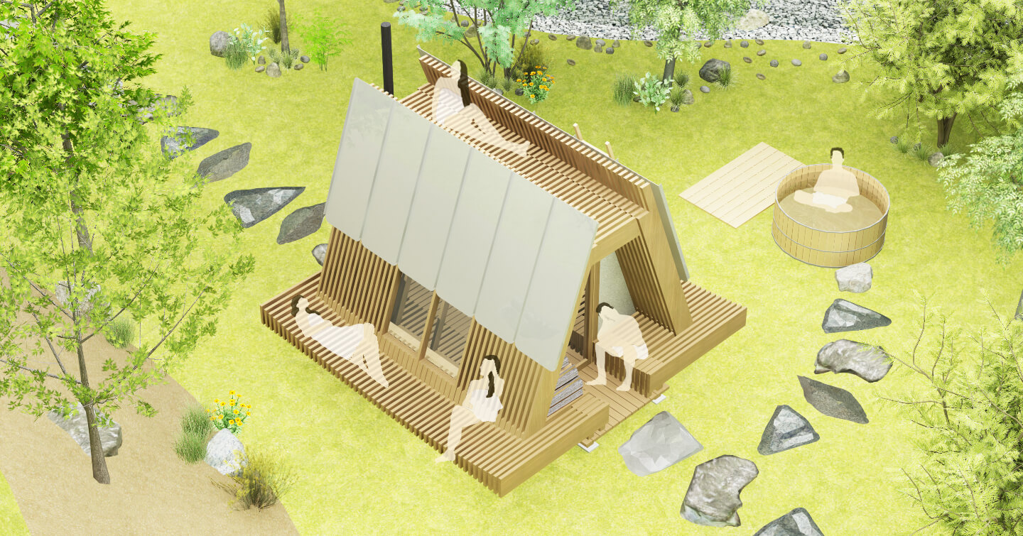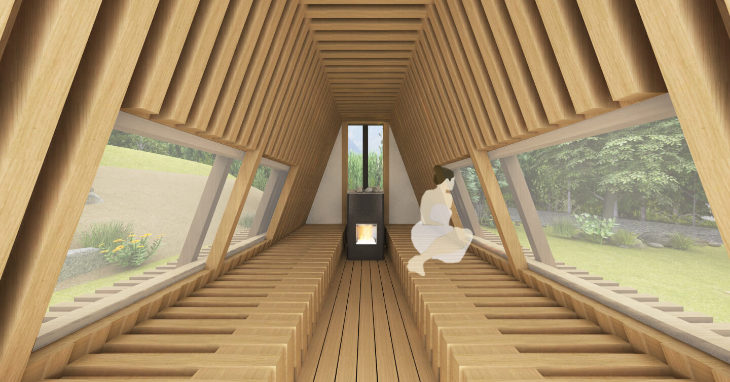 サウナ体験にとって重要なのは熱いサウナから出て冷水を浴びて体を冷やした後だと考えます。 360°の大自然を眺めながらととのう時間を楽しめるように合掌造りに似た小屋の内外に長いベンチ・展望スペースなどいくつかの仕掛けを作り様々な体勢でくつろぐことのできるサウナを作ります。