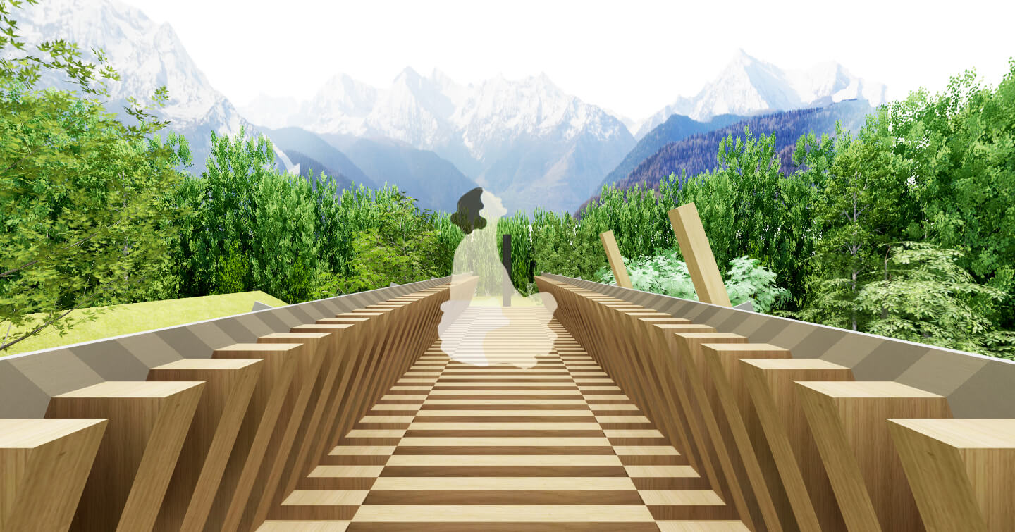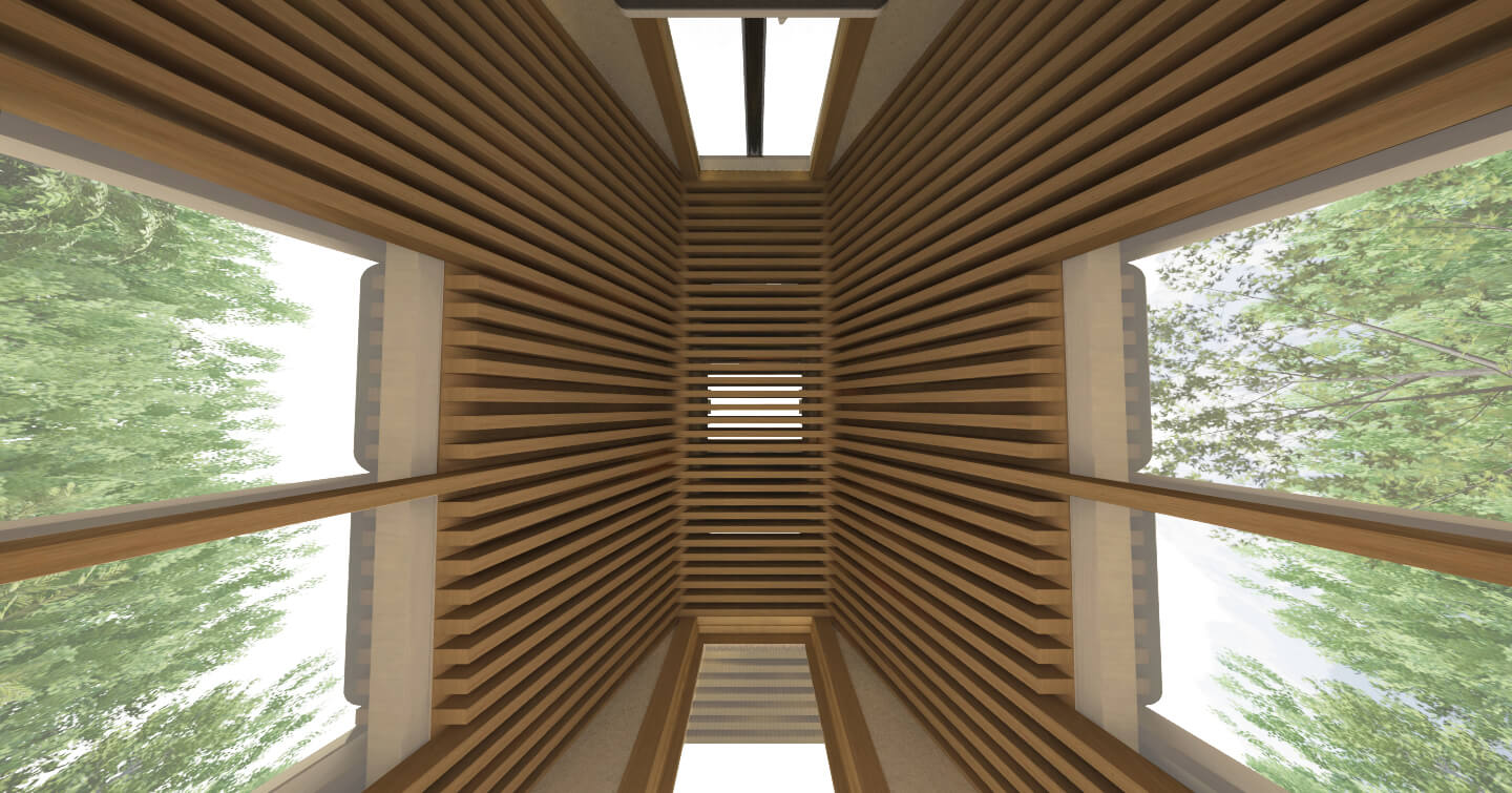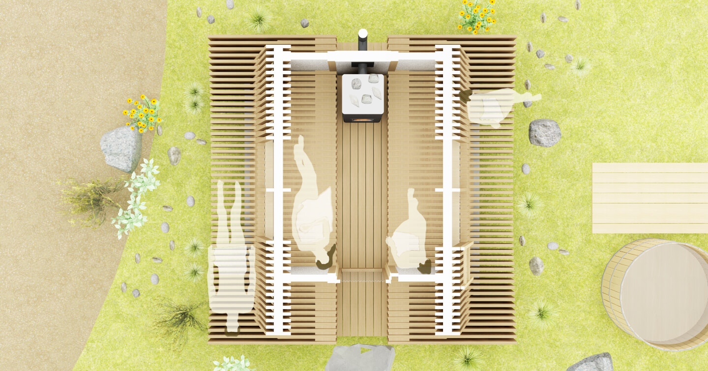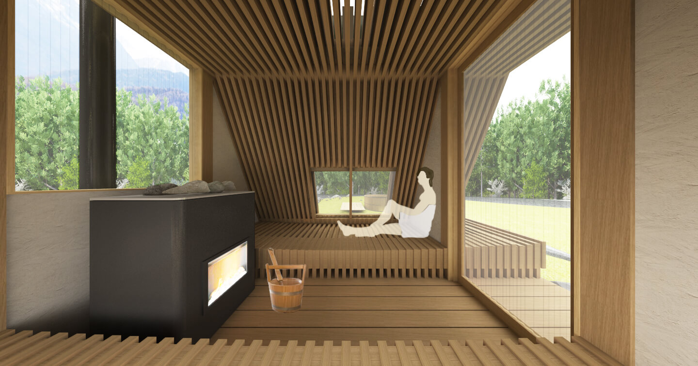 サウナ体験にとって重要なのは熱いサウナから出て冷水を浴びて体を冷やした後だと考えます。 360°の大自然を眺めながらととのう時間を楽しめるように合掌造りに似た小屋の内外に長いベンチ・展望スペースなどいくつかの仕掛けを作り様々な体勢でくつろぐことのできるサウナを作ります。