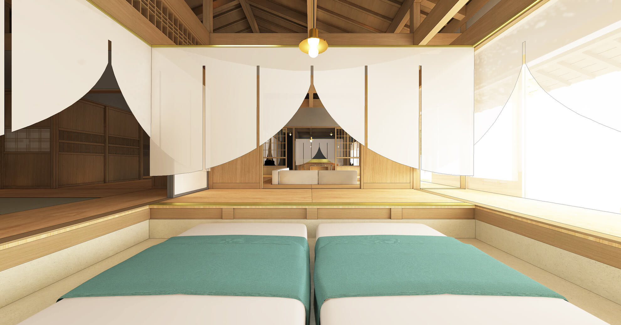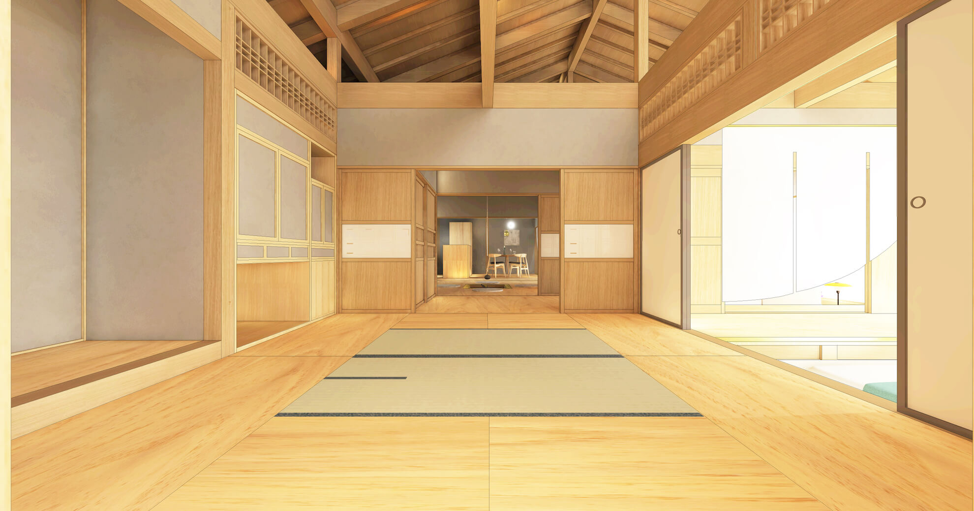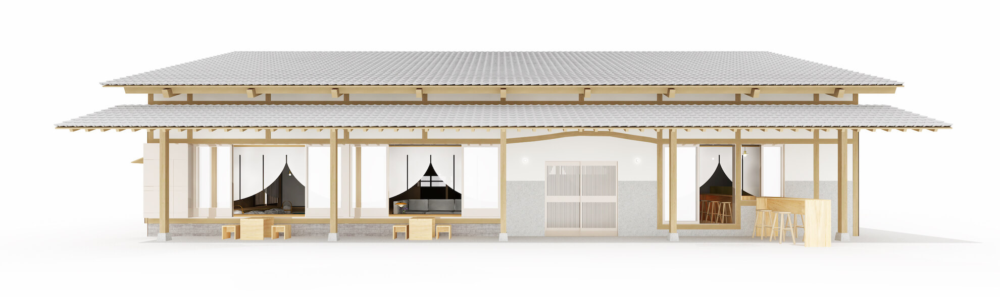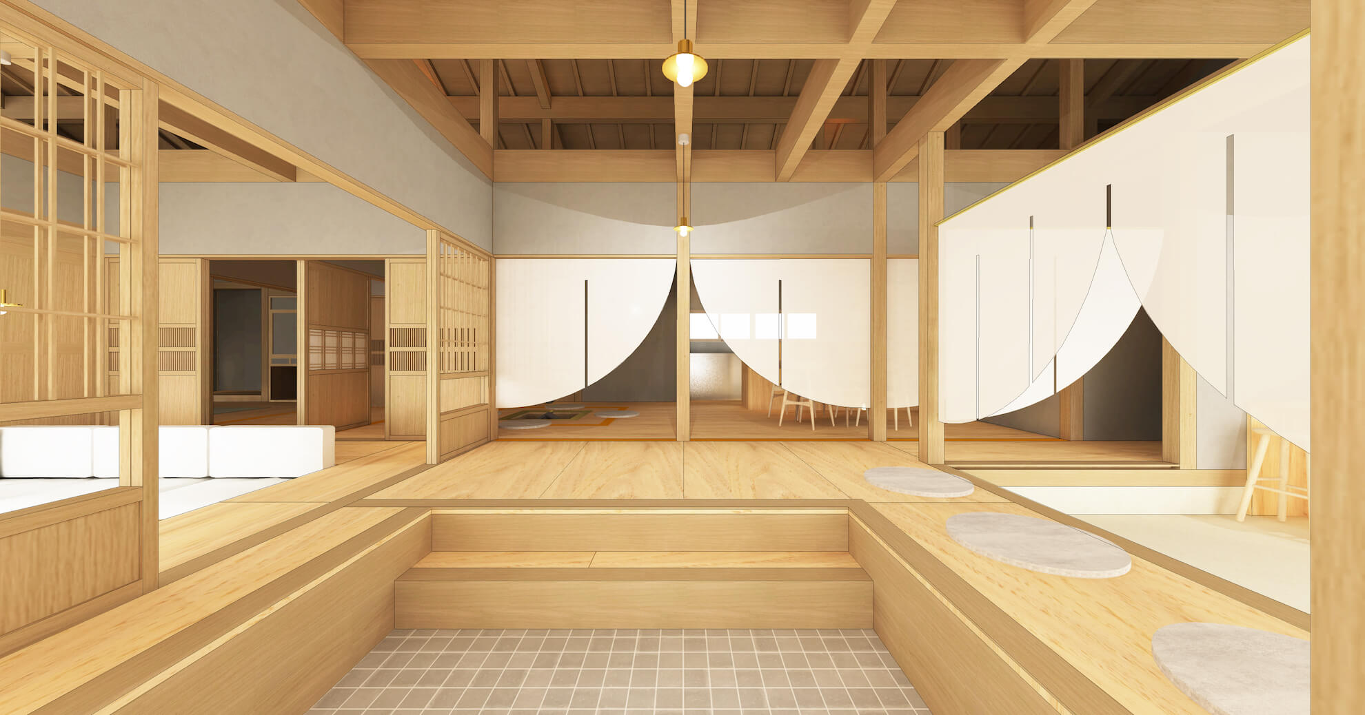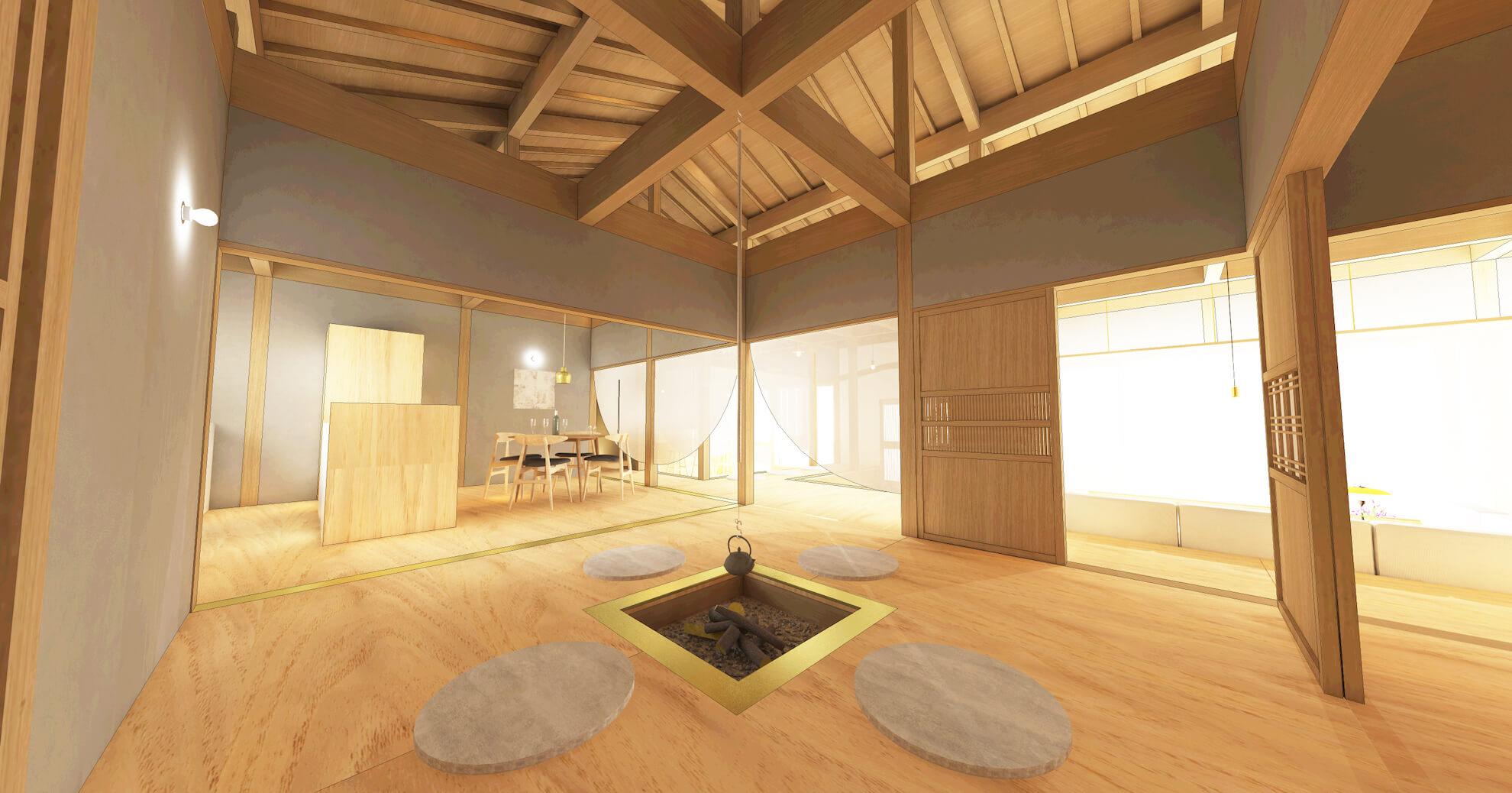 古民家の前面に広がる美しい山々と田畑の連続する風景は都市部での生活で感じることのできない自然の豊かさ・雄大さを感じさせてくれます。 そこでこの風景を室内に最大限取り込むために窓周りに暖簾を設置して内観・外観の空間のアクセントとして改修を行います。
