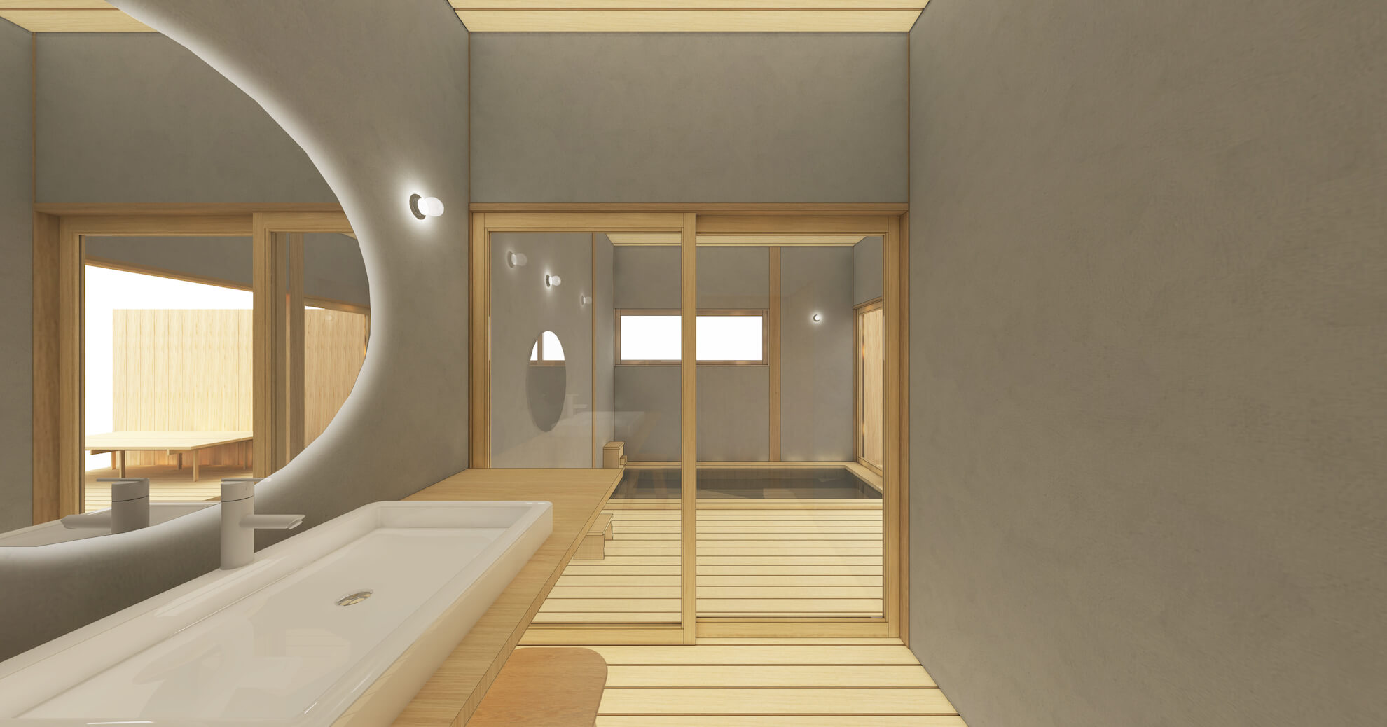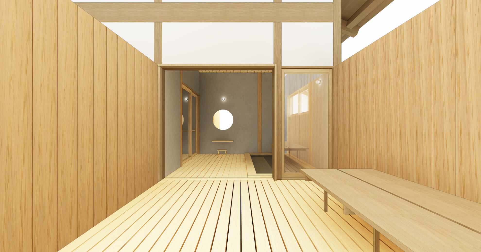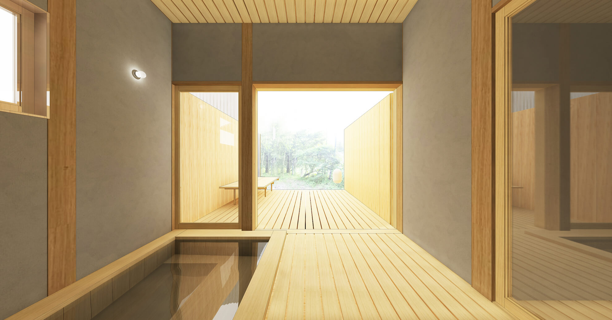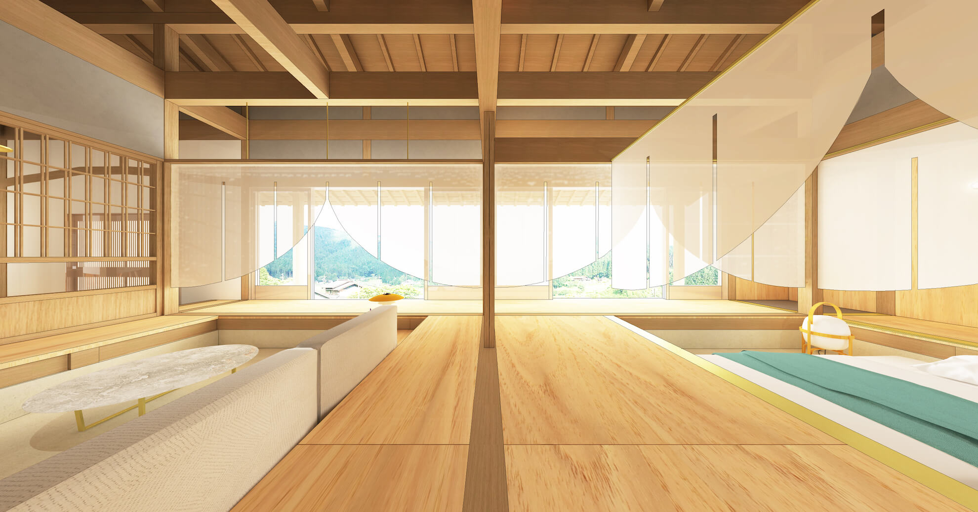 古民家の前面に広がる美しい山々と田畑の連続する風景は都市部での生活で感じることのできない自然の豊かさ・雄大さを感じさせてくれます。 そこでこの風景を室内に最大限取り込むために窓周りに暖簾を設置して内観・外観の空間のアクセントとして改修を行います。